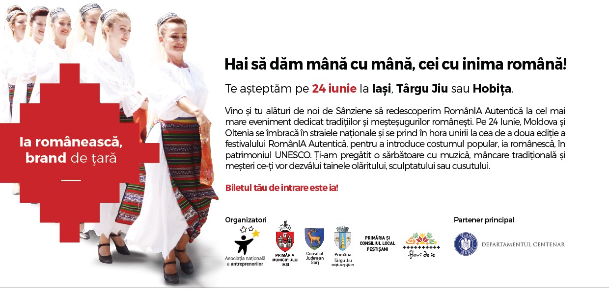 RomanIA Autentica se imbraca in straie de sarbatoare, pe 24 iunie la Iasi, Targu Jiu si Hobita! Cea de a doua editie a evenimentului RomanIA Autentica va avea loc anul acesta atat la Iasi, la Palatul Culturii, cat si la Targu Jiu, Hobita, comuna Pestisani, Acasa la Brancusi, la fel ca si anul trecut.