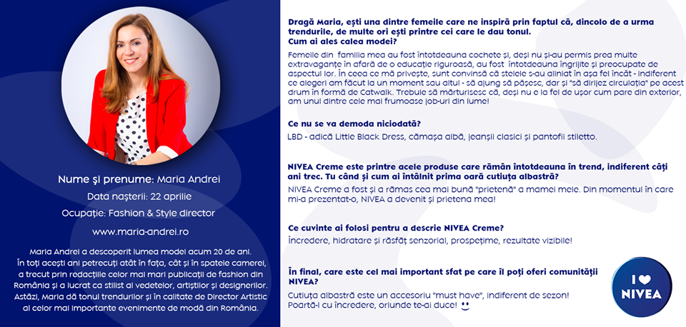 Pe 11 aprilie, Nivea a sarbatorit cutiuta albastra NIVEA printr-un interviu special cu Maria Andrei, o femeie care ne inspira atat in materie de ingrijire cat si in materie de stil.